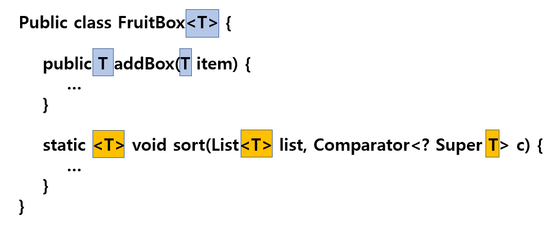 μ λ€λ¦ ν΄λμ€ FruitBoxμ μ μΈλ νμ λ§€κ°λ³μ Tμ μ λ€λ¦ λ©μλ sort()μ μ μΈλ νμ λ§€κ°λ³μ Tλ νμ λ¬Έμλ§ κ°μ λΏ μλ‘ λ€λ₯Έ κ²μ΄λ€.